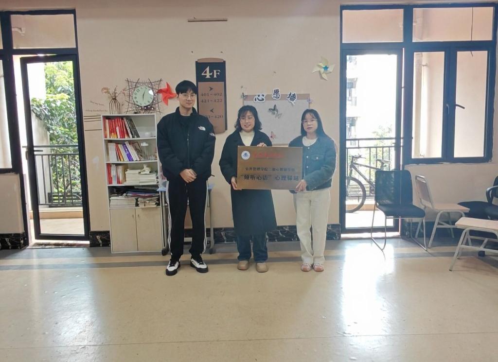 活动上,公共管理学院学生党支部组织委员李士家、学生党支部书记王春凤与心理健康教育中心王慧为“心理驿站”授牌。