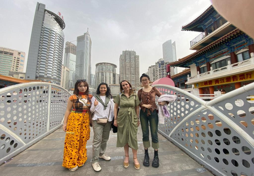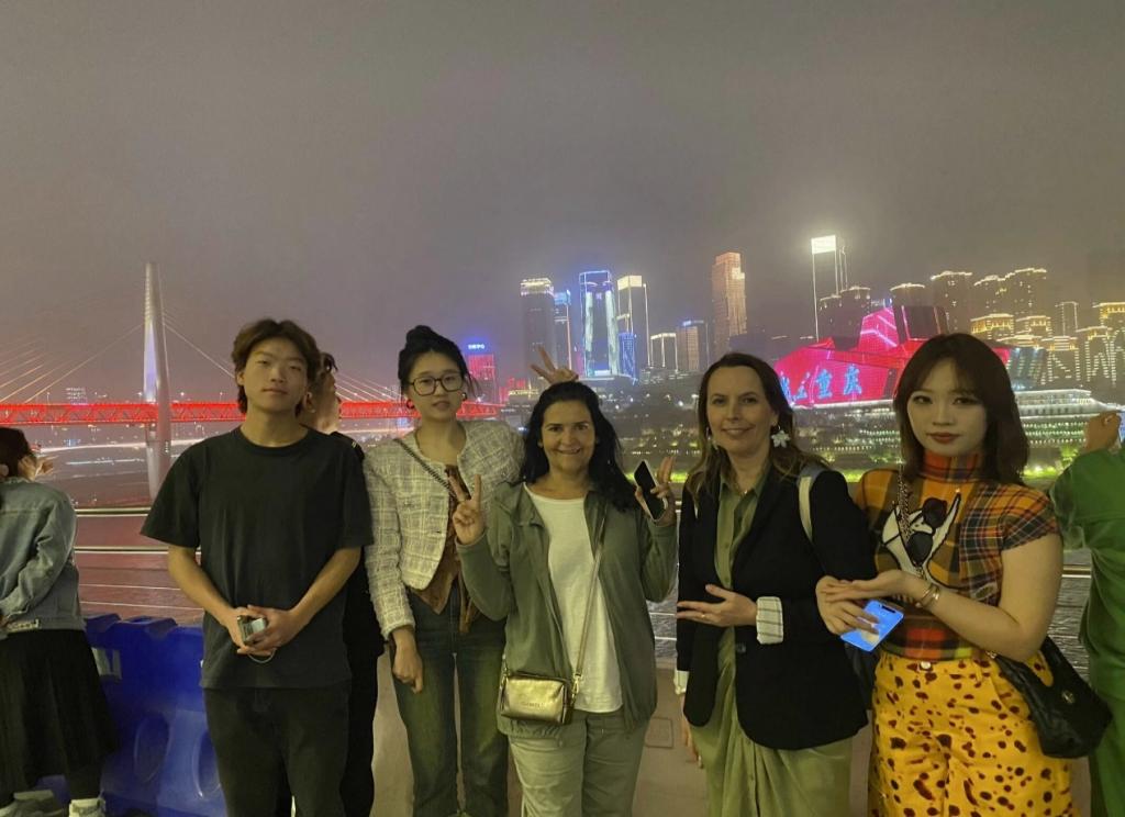 次日,西语教师黄明佳带领学生志愿者伍欣然、杨砚迪,与外教一同深入体验山城文化。在李子坝轻轨站,“轻轨穿楼”的奇观令众人惊叹;解放碑商圈中,历史碑体与现代建筑、传统蜀绣与潮流单品并存,尽显历史与现代的交融。当晚,热辣的重庆火锅和南滨路500架无人机拼出的重庆地标图案,将文化体验推向高潮。