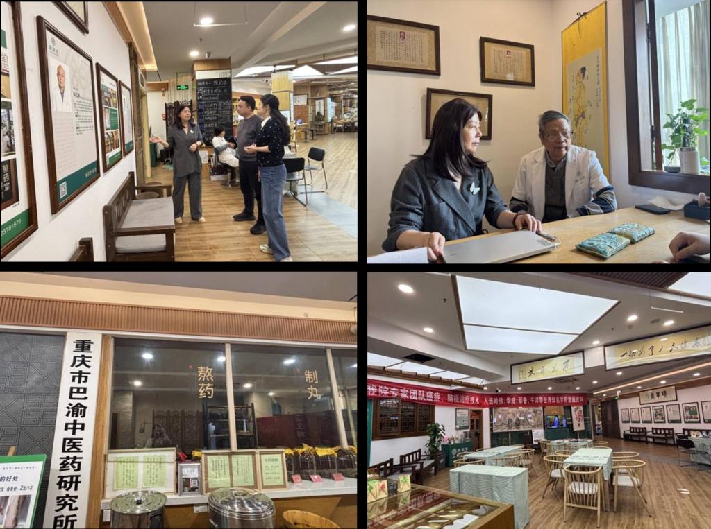 中医馆负责人杨总首先陪同学院一行,实地考察了诊疗中心、康复理疗区、中药房、巴渝中医药研究所等核心区域,详细了解中医馆在中医诊疗技术传承、医养结合服务模式等方面的创新实践。书记和院长现场体验了中医按摩理疗,在资深医师 “精准取穴、辨证施术” 的手法中,切身感受传统医学 “治未病” 理念与现代健康管理的深度契合。