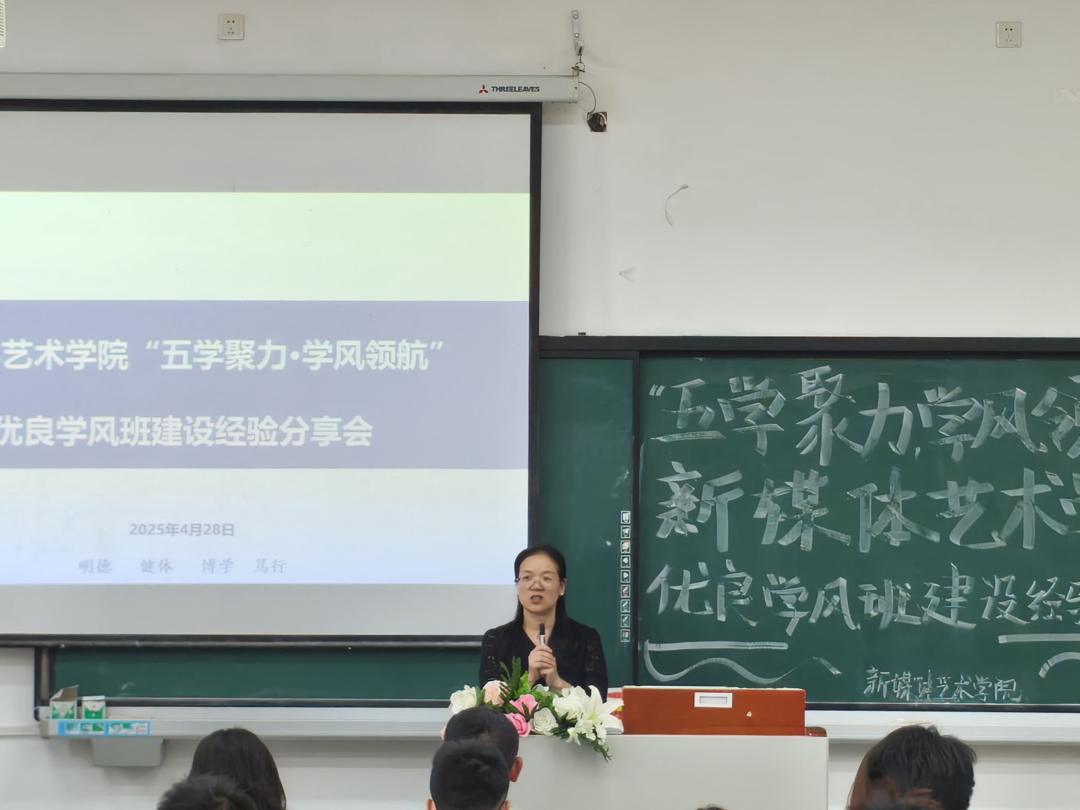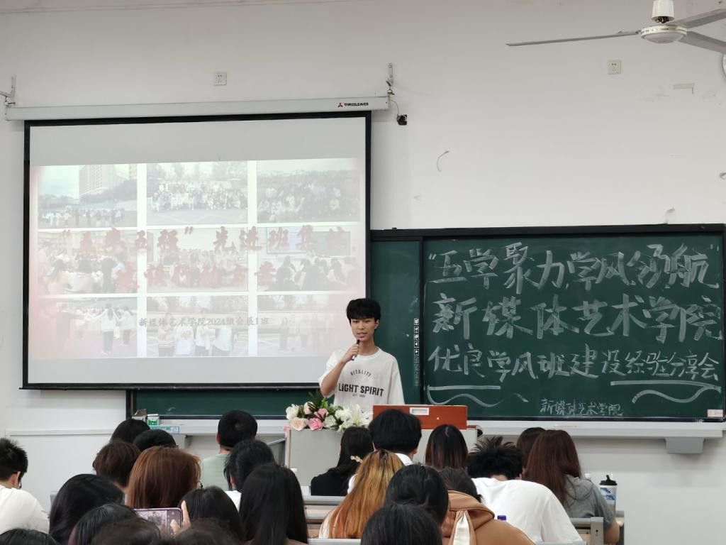 4月28日,我校新媒体艺术学院在教学楼1301教室召开“五学聚力·学风领航”优良学风班建设经验分享会。学院党总支书记甘雪梅、相关教师及学生代表共80余人参加。活动聚焦“标杆示范-经验共享-协同提升”三个环节,旨在营造良好的学风建设氛围。