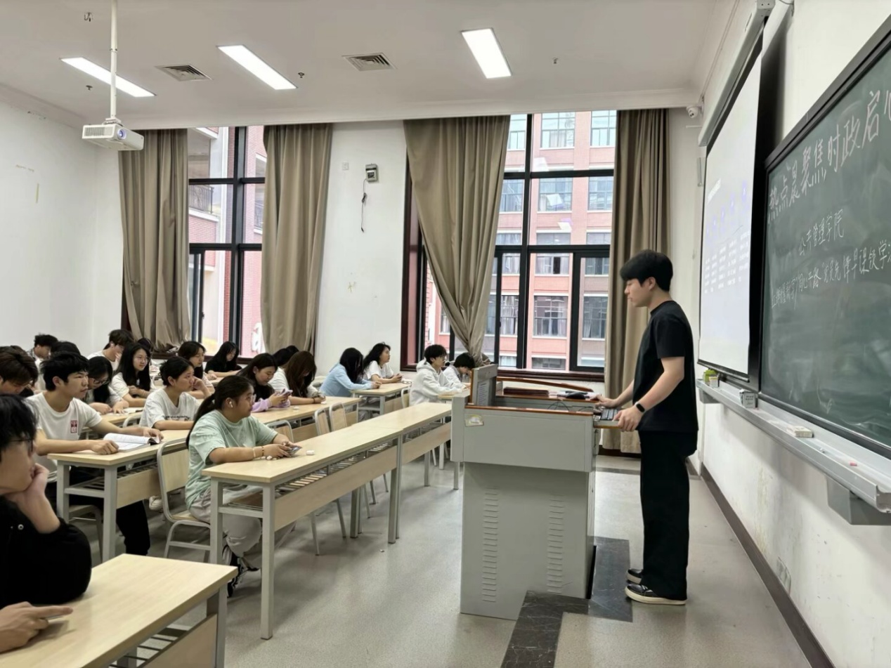 紧随其后的“3分钟背景分析”环节,领学党员化身“时政解读者”,从历史渊源、现实背景、社会影响等多维度深入剖析热点事件。他们以专业的视角、详实的数据、生动的案例,抽丝剥茧般揭示热点背后的逻辑链条,让同学们不仅看到事件的表象,更能洞察其深层次的原因和意义。领学党员解读政策出台的时代背景、目标导向以及可能带来的社会效应,帮助同学们构建起“现象—本质—联系”的思维框架,在潜移默化中提升政治敏锐度和分析能力,让时政学习不再停留在表面,而是深入到思想层面的理解与思考。