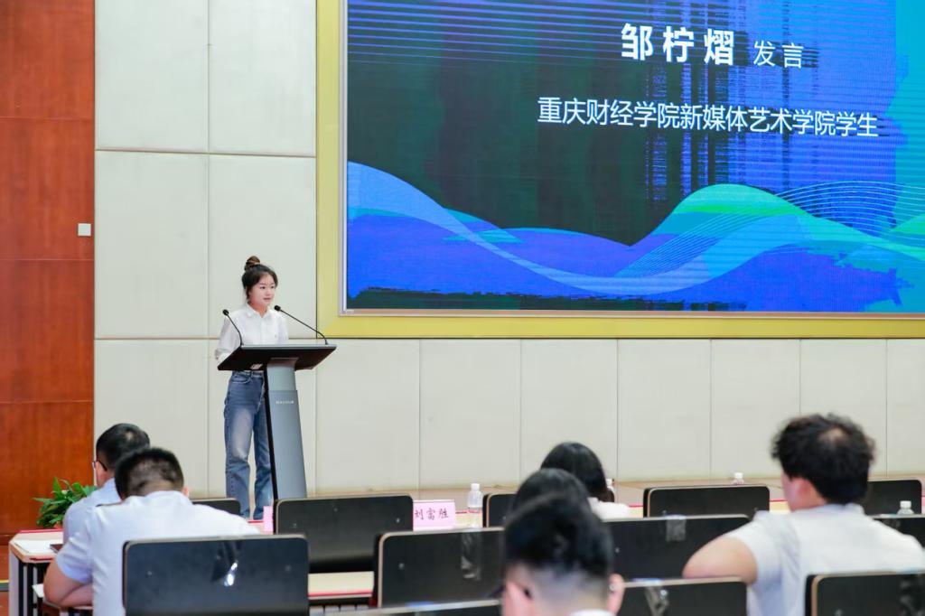 在交流座谈会阶段,来自重庆大学、西南政法大学、洛阳职业技术学院等高校的6名学生代表,围绕“破圈与扎根:青年理论传播的守正创新之道”这一主题进行了交流发言,新媒体艺术学院邹柠熠同学围绕“以青年之声、点亮时代之光”为主题作为唯一一所民办院校的学生代表进行发言,将自己创作视频的经历、经验进行了分享与总结。
