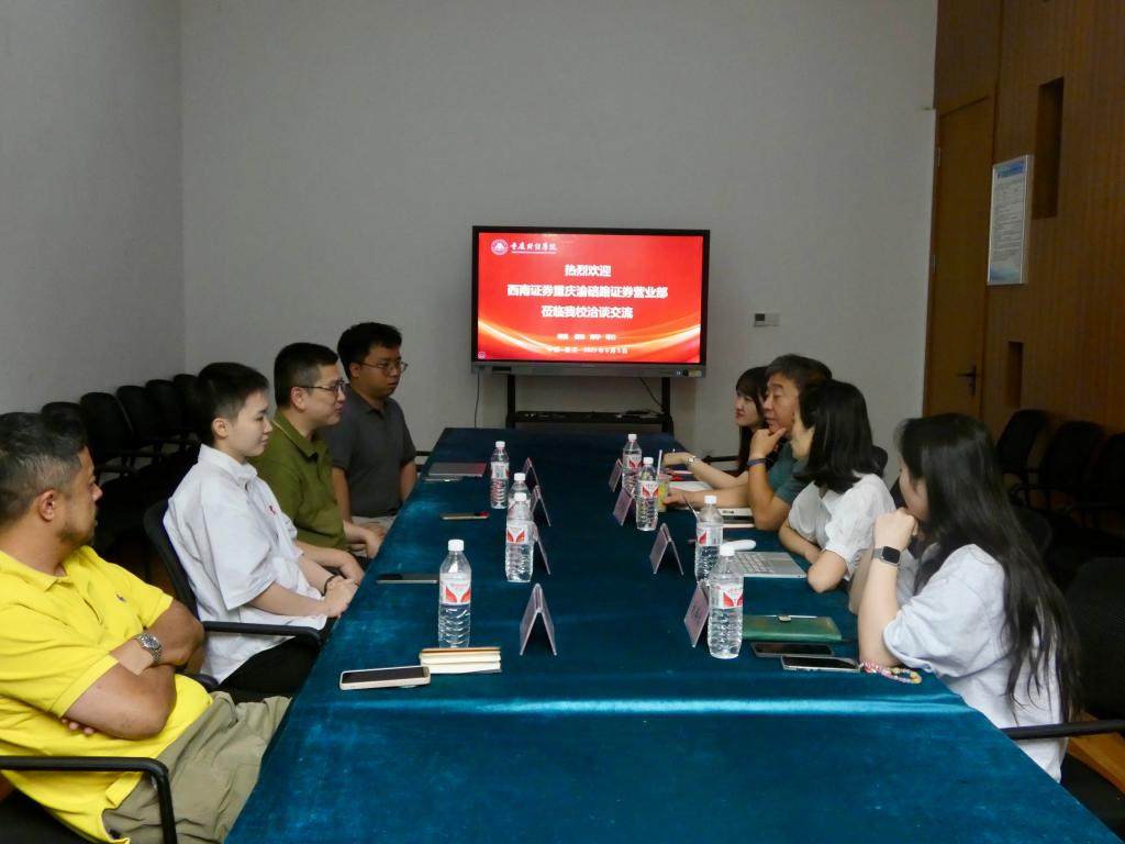 6 月 5 日,西南证券重庆第一分公司第二党支部书记、渝碚路营业部总经理唐文俊,副总经理杨丽杉,高级投资顾问雷强及业务经理助理崔文睿(我校20级毕业生)一行到访金融学院,与学院党总支副书记张玉华、学团办主任于成江、学生第一党支部书记刘玲沐、第二党支部书记封荩然等,在图书馆大研讨室围绕党建共建、实习就业、社会实践等展开深度交流。