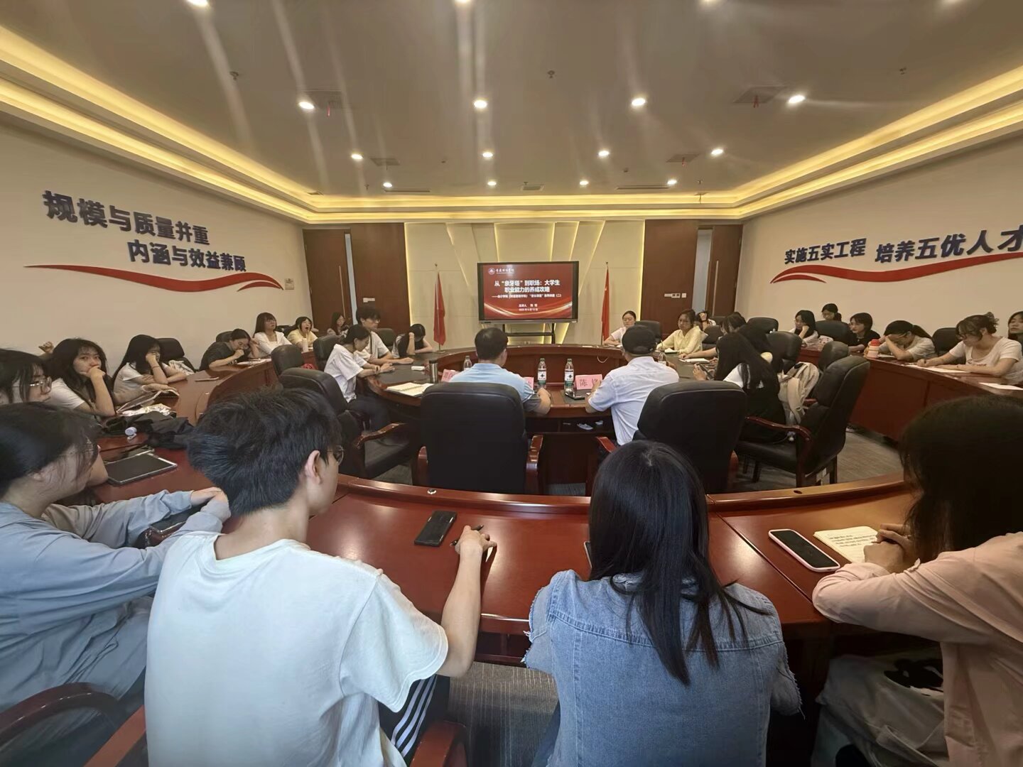 为进一步深化家校协同育人,精准引导学生科学规划职业发展目标,全面提升学生的综合素养与核心竞争力,实现从校园到职场的顺利过渡。近日,我校会计学院(财富管理学院)在行政楼2302会议室举办了主题为“从‘象牙塔’到职场:大学生职业能力的养成攻略”之家长课堂系列讲座第二讲。此次讲座特邀学生家长陈锋先生担任主讲,学院党总支副书记、学团办主任、专职辅导员及45名学生代表参加。
