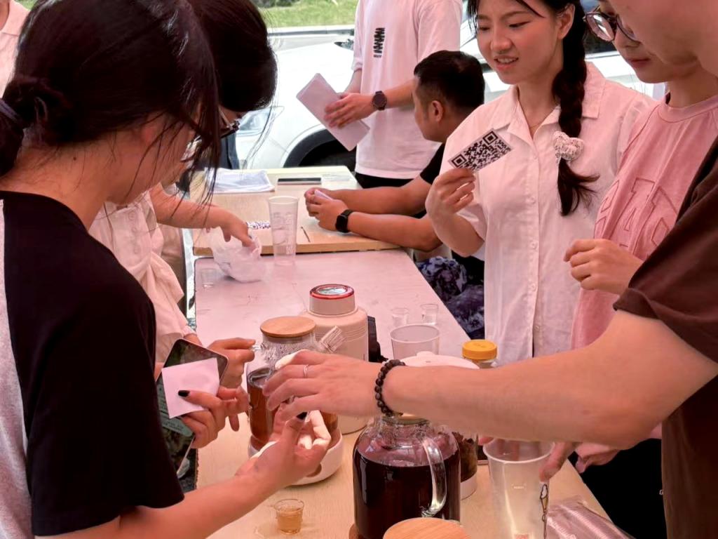活动面向全校师生,设置识药挑战、中医养生问答、养生茶、体质测试、功法习练等七大沉浸式体验区,吸引数百人参与体验。识药辨方区,15种中药标本整齐摆放,同学们凑近闻香、触摸感受,认真辨识。茶饮体验区,体验养生茶(酸梅汤、薏苡仁茶、生脉饮等)的配方、试饮。功法教学区,带领太极和八段锦的一招一式。艾灸体验区,亲身体验中医的独特魅力。