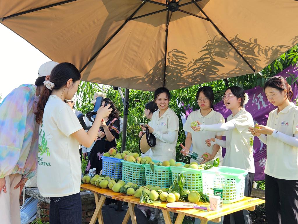 为践行乡村振兴战略,推动高校智力资源下沉基层,7月2日,我校会计学院爱国主义实践团走进巴南区界石镇界南水果种植专业合作社,以“轻直播”模式开展“青衿赴桃宴・助农添新彩”主题活动,通过“田间问需—数字赋能—品牌创新”的全链条服务,为香桃节预热注入青春动能。