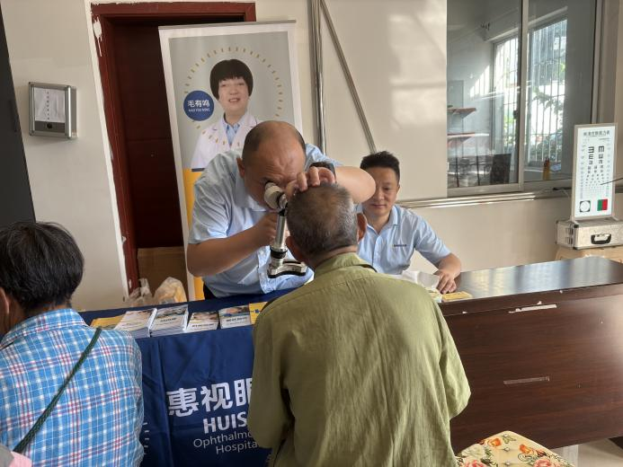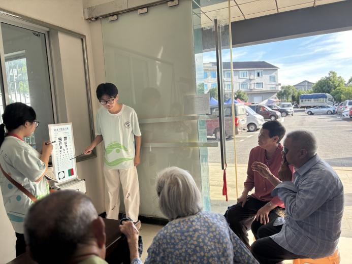 实践服务,联合体检守护健康。实践团携手惠视眼科医生团队,在干湾村办事大厅设立血压测量、眼睛检查点。医生团队指导实践团成员为村民进行视力检测、白内障检测、血压测量,为村民建立“一人一档”健康档案。实践团成员23健管班蒋京成以所学专业知识,为村民进行视力检测,并为村民讲解保护眼睛健康知识,解答村民健康相关问题。