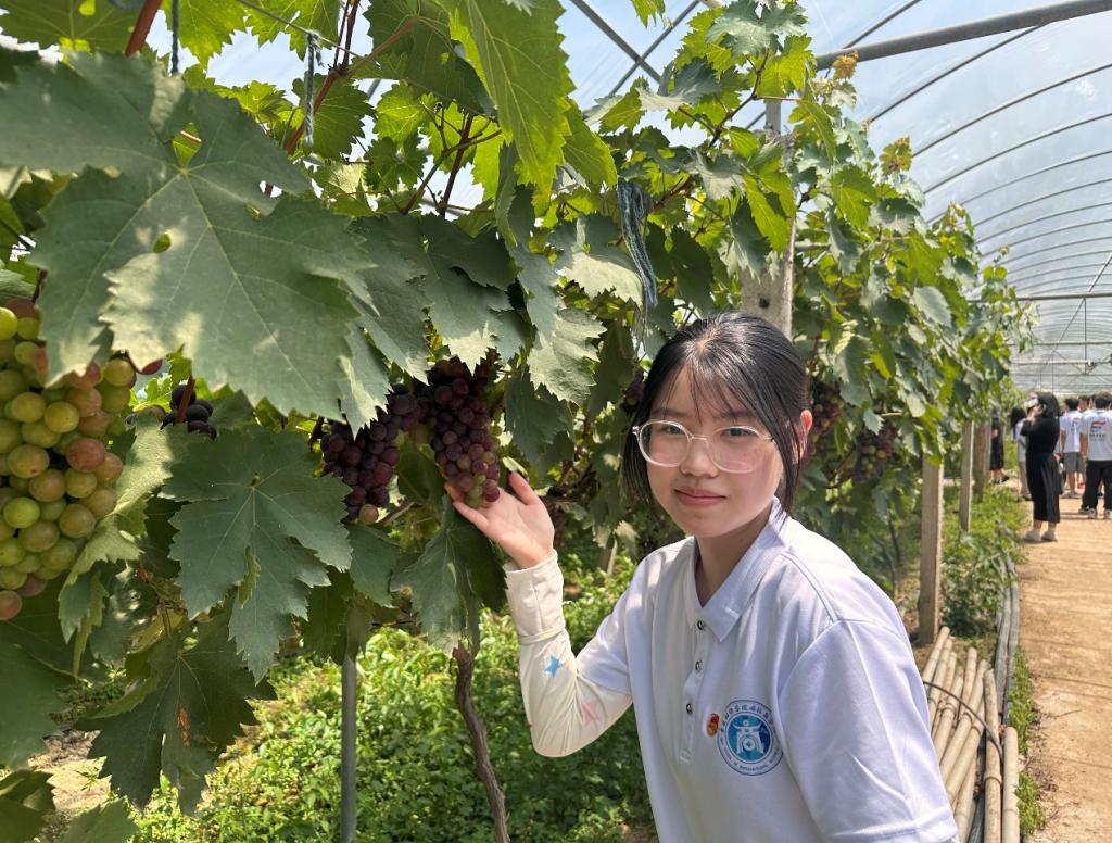 在果园负责人带领下,队员们系统了解了葡萄园的种植结构、品种优势及运营模式。园中“醉金香”、 “红玫瑰”等优质品种生机盎然,生态种植与现代科技融合令人印象深刻。随后,志愿者们积极参与疏果、套袋等实际劳动,将书本知识转化为动手能力,在汗水与泥土中感受现代农业的力量。