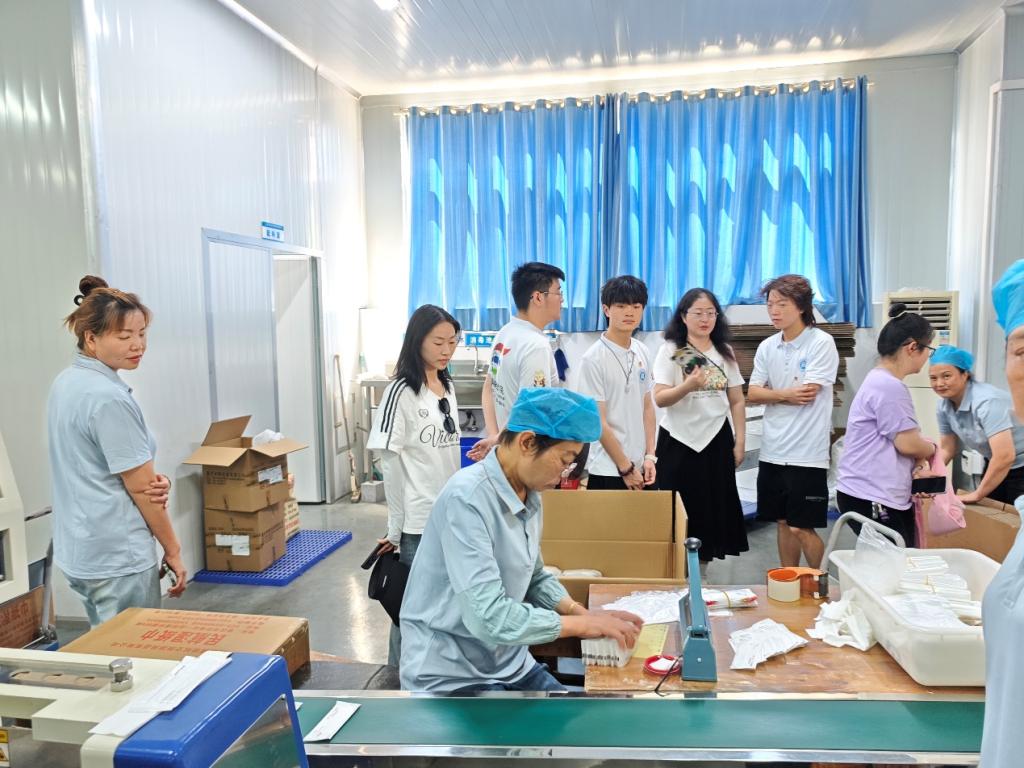 在一品街道企业负责人田代红带领下,实践团成员实地参观了湿纸巾生产车间,依次了解原材料预处理、折叠裁切、消毒封装等关键环节。管理人员详细介绍了企业在材料选择、工艺控制、产线规划等方面的管理理念与创新实践。“我们注重每一个细节,精选优质无纺布与食品级添加剂,同时科学规划流程、提升效率,确保产品质量与产能双达标。”这些做法让同学们深刻感受到工业工程在提升企业运营效能中的关键作用。