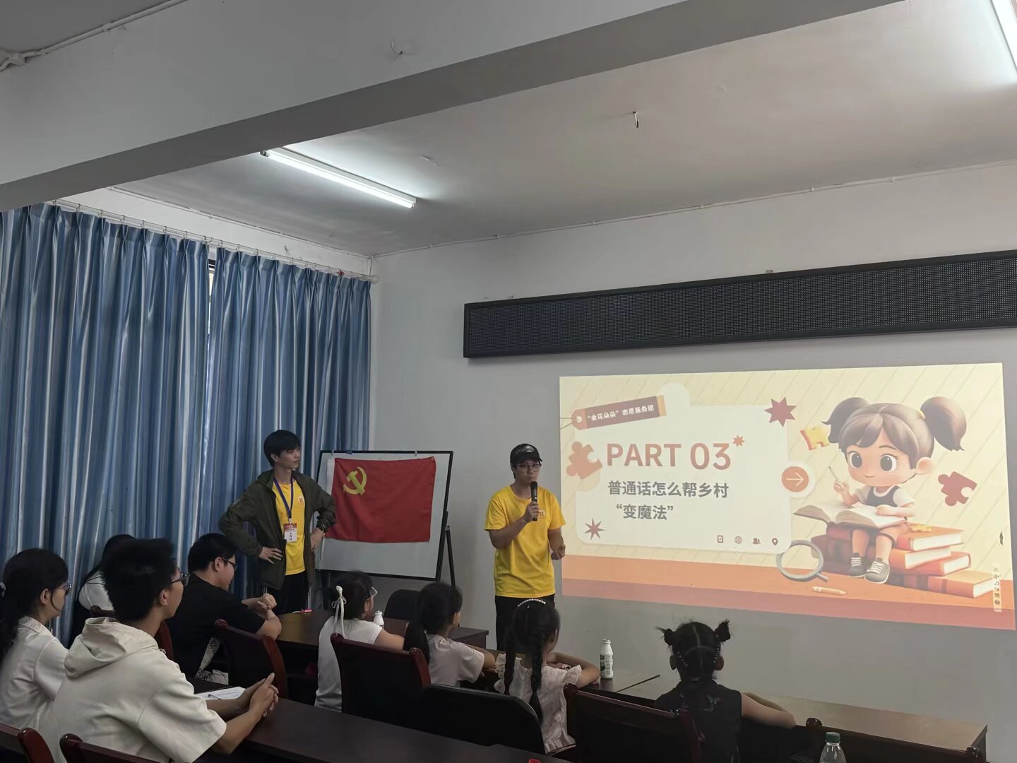 活动开场,“金花朵朵”志愿服务团“成员郭静轩、张书源向社区青少年开展普通话宣讲。此次宣讲以“为什么学习普通话”为切入点,阐释其历史渊源、用途与意义,还将普通话与乡村文化结合,描绘借助标准语言推动乡村发展的美好图景。课堂上,志愿者结合乡村文化,融入风土人情、传统习俗等元素,通过讲述故事让孩子学习发音与表达。此外,还组织绕口令,朗诵比赛等互动游戏,提高孩子普通话水平与自信表达能力。“故今日之责任,不在他人,而全在我少年”孩子们稚嫩又坚定的声音,传递着传承语言文化、助力家乡发展的坚定信念。
