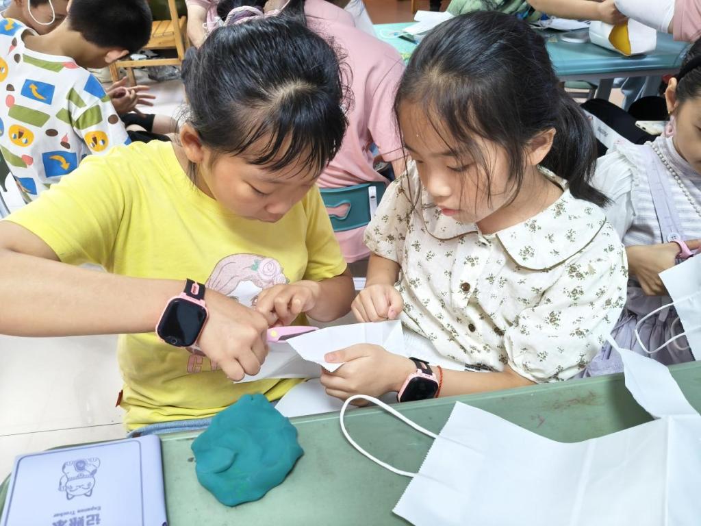 活动,实践团成员化身“小老师”,带领社区青少年开启了一场别开生面的“旧物改造工作坊”。成员们巧妙利用常见的废弃奶茶包装袋,现场示范如何通过剪裁、折叠和装饰,将其制作成实用的多功能分装同时引导小朋友发挥创意在改造包装袋上绘制独特的图案,将废弃物转化为兼具实用性与艺术性的文化载体。这一过程有效锻炼了孩子们的动手能力和创新思维。
