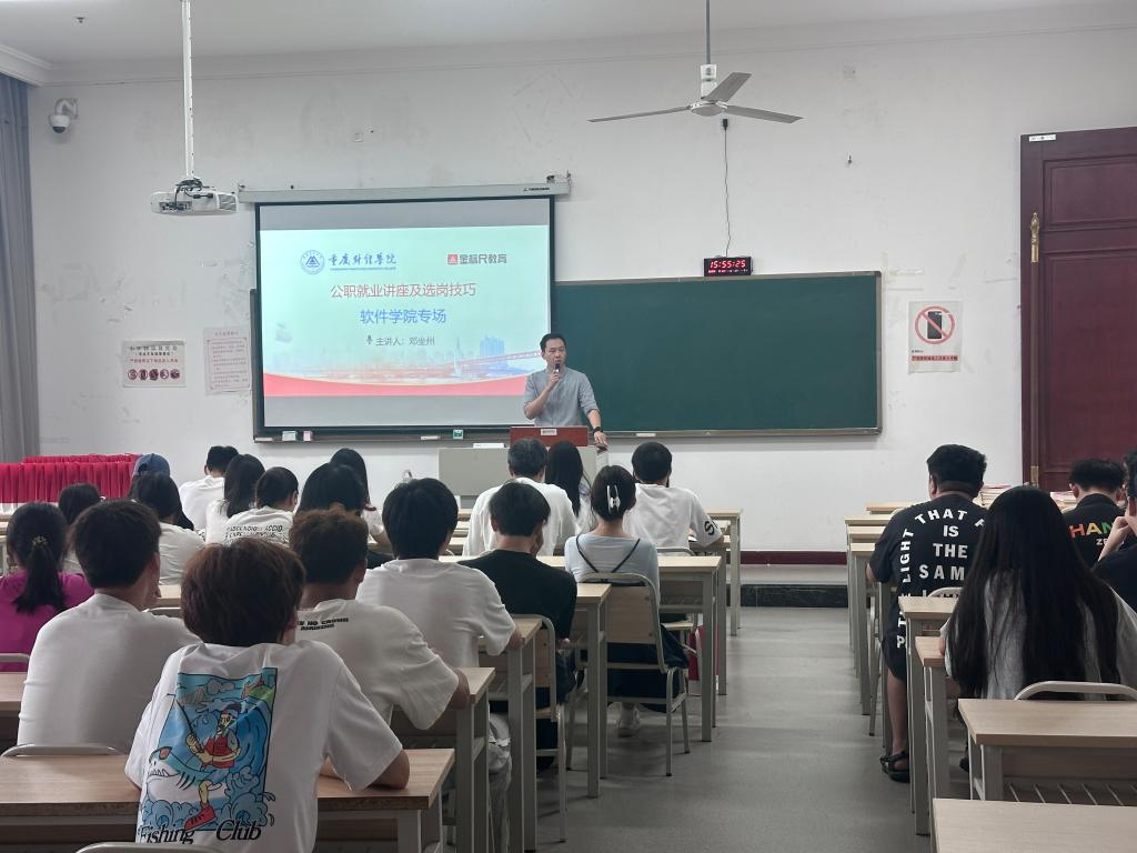 面对持续升温的“考公热”,为破解学子们在精准选岗与高效备考中的难题,2025年9月23日,软件学院与金标尺教育携手,于学院1614教室成功举办了“公职就业及选岗技巧”专题讲座。本次活动旨在为处于备考关键期与职业迷茫期的学子提供权威、精准的指导,助力其职业规划与发展。