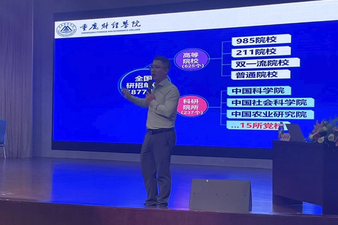 本次讲座特邀重庆工商大学教育科技分会常务理事、企业导师蒋世伟担任主讲。蒋老师首先结合教育部近十年数据,系统分析了当前考研形势与竞争态势,指出报考人数虽持续攀升,但录取比例总体稳定。他以877所研究生招生单位和25个硕士专业类别为例,为同学们提供了精准的择校与专业选择建议,强调因人制宜、理性定位,避免盲目报考。