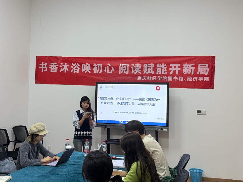 为搭建深度阅读与思想碰撞的平台,助力学子结合专业分流深化社会认知,10月23日下午,图书馆联合经济学院在图书馆大研讨室开展《国家为什么会失败》(2024经济学诺贝尔得主德隆·阿西莫格鲁著)围读活动。本次分享由杨麒渊老师主讲并全程指导,经济学院副院长刘春兰、图书馆管理员寸家菊老师、经济学院学团办主任蔡婷老师受邀出席,25名热爱阅读的同学齐聚一堂,在共读研讨中探索制度逻辑,为个人成长与发展积蓄思想力量。