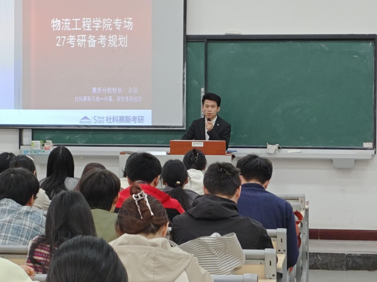 为落实学生分流培养工作,帮助2023级意向考研学生顺利备考。10月23日,我校物流工程学院(国际商学院)在教学楼1320教室举办2023级学生专场考研讲座,邀请到社科赛斯考研规划专家金磊老师担任主讲嘉宾,吸引众多学生到场聆听。契合学校“个个有赛道,人人能出彩”的分流培养目标,帮助学生明晰考研方向,科学制定备考策略。
