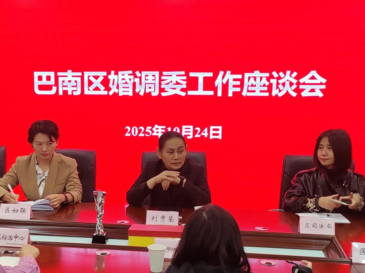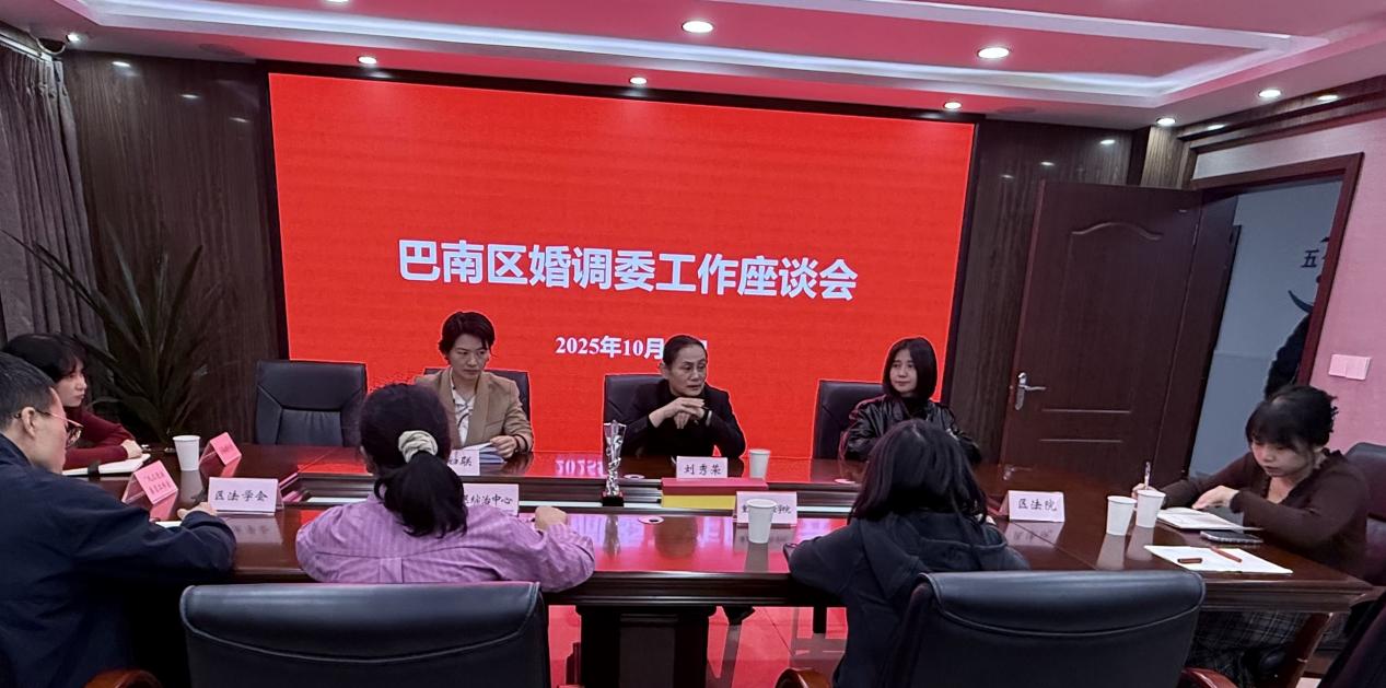 2025年10月24日,巴南区婚姻家庭纠纷人民调解委员会工作座谈会在区公安局综合治理中心会议室召开。我校双创中心主任莫紫霄代表学校参会并发言,与区妇联、区法院、区司法局、九三学社巴南工委等相关单位代表围绕婚姻家庭纠纷调解提质增效、校政协同育人机制构建等内容展开深入交流,共同探索“专业调解+实践育人”融合新模式,为推动学生通识能力多元成长、落实“个个有赛道、人人能出彩”育人理念搭建高质量实践平台。