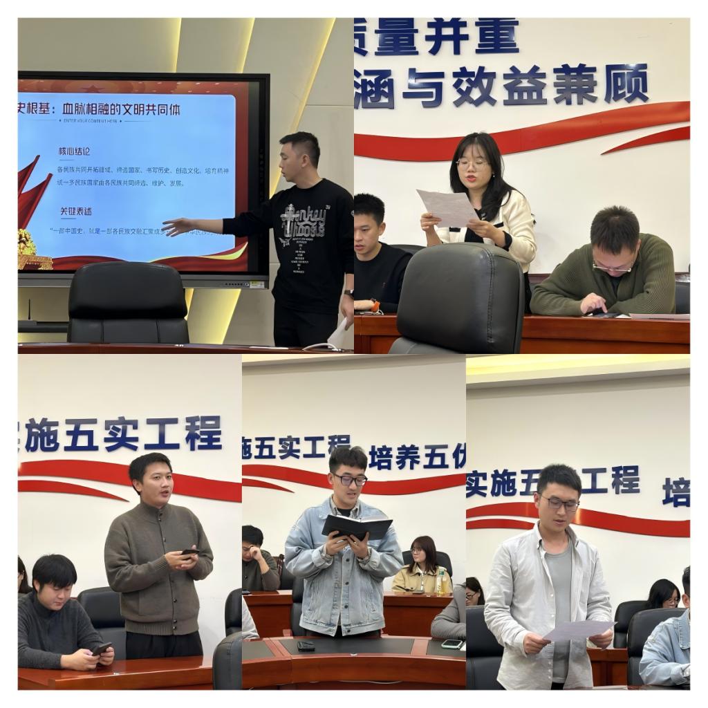 会议通过视频学习、领学解读和交流研讨等形式展开。与会人员集中学习了党的二十届四中全会精神,教师党员郑嘉安系统阐释了中华民族共同体形成与发展的历史必然性,辅导员张仁洋领学了《中华人民共和国法治宣传教育法》的核心内容与实践要求。