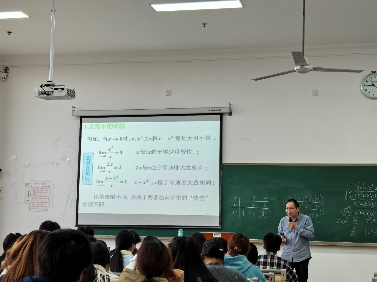 李老师以“无穷小阶的比较”为主题,从未定式预习题入手,然后以几个无穷小比值的极限结果引发学生思考;利用数据计,并结合图形直观,讲解并证明了等价无穷小替换定理,重点讲解了该定理的实际应用,并结合“雨课堂”进行了实战训练。