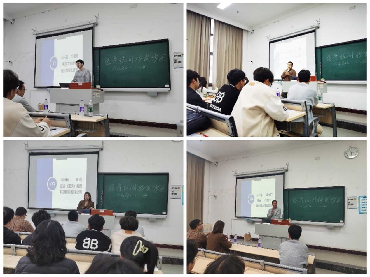 本次校友沙龙秉持分类培养理念,特邀四位不同届次的优秀校友代表参与分享,包括2019届一宁夏布非遗传承代表陈克厂、2020届立信(重庆)数据科技股份有限公司校友操霞、2022届重庆茶姬企业管理有限公司校友谭鑫,以及2024届重庆工商大学在读硕士丁潜龙。他们围绕自主创业、行业咨询、数据分析和学历提升等多个方向,为2025级经济统计学专业新生提供了多维度的发展借鉴与务实建议。