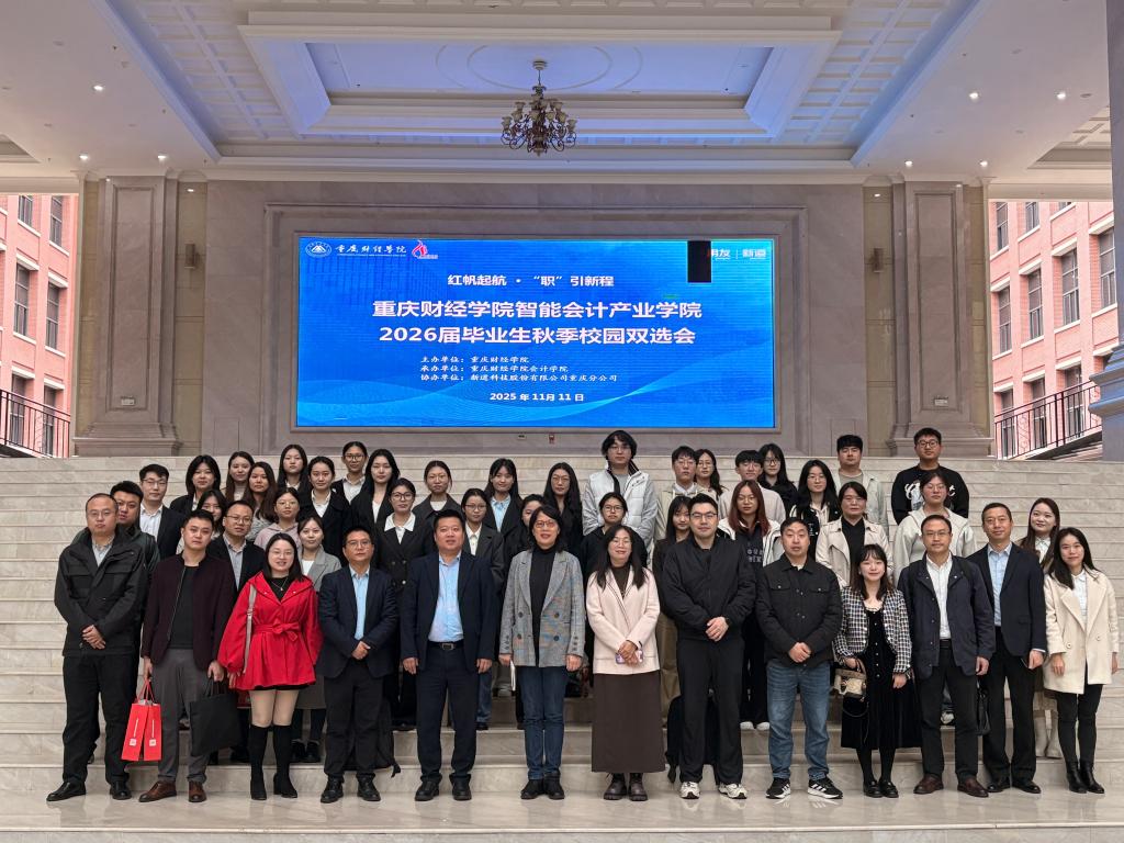 上午9时,智能会计产业学院 2026 届毕业生秋季双选会启动仪式在教学楼 1206 教室隆重举行,新道科技股份有限公司重庆分公司总经理徐福年、教务服务总监李志良、校企合作经理莫正海、学校副校长兼会计学院院长陈旭、会计学院党总支书记宋钰静、常务副院长陈凤、副院长鲍晓敏、党总支副书记冉光波、院长助理韩佳佚及10家企业代表出席启动仪式,40余名智能会计产业学院学生参加会议,启动仪式由新道科技股份有限公司驻校导师朱小芳主持。学校副校长兼会计学院院长陈旭、新道科技股份有限公司重庆分公司总经理徐福年、学生代表冉韵分别从 “校、企、生” 三方维度出发,一致表示将以此次双选会为重要纽带,持续深化校企协同合作,优化人才培养方案,探索多元合作新模式,聚力实现 “校企双赢、共同发展” 的核心目标。陈旭副校长寄语毕业生,希望同学们紧抓就业机遇,以扎实的专业素养实现个人价值,为社会经济高质量发展贡献青春力量。