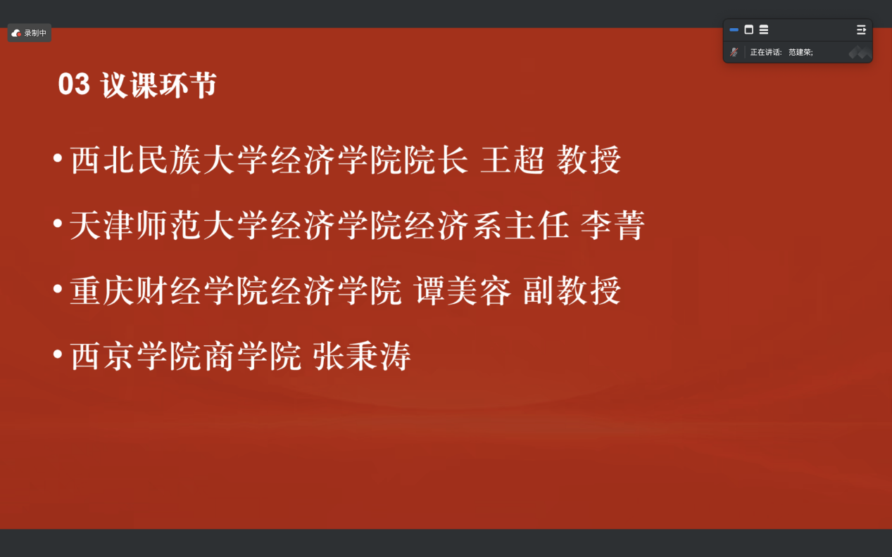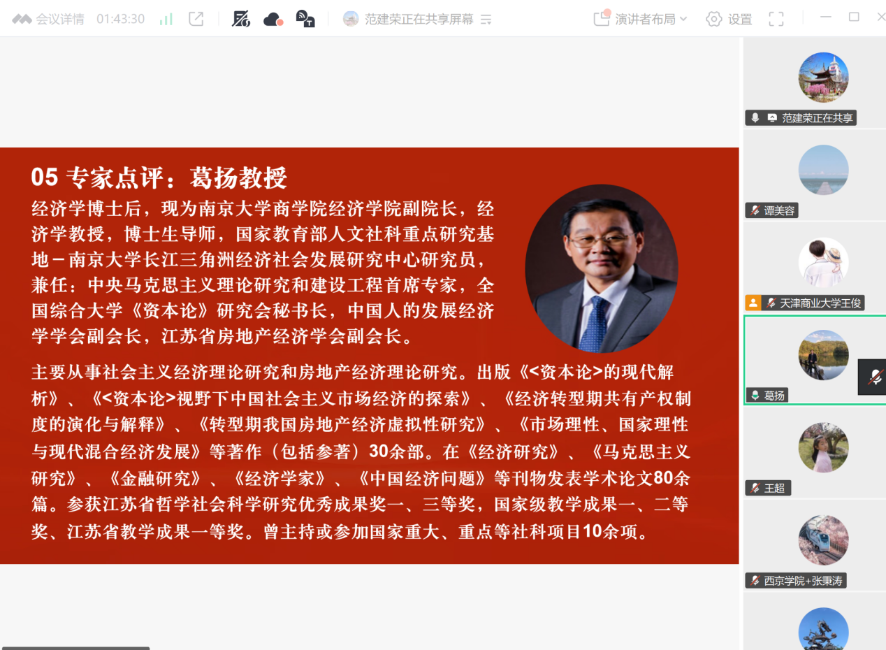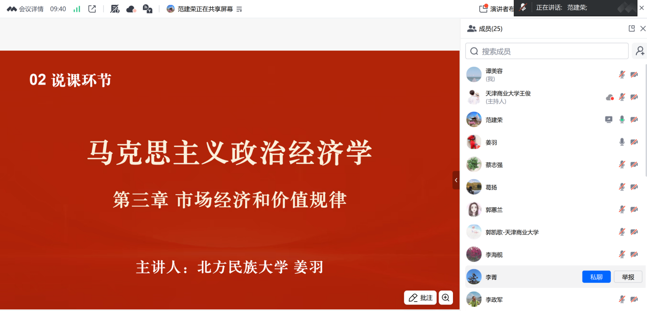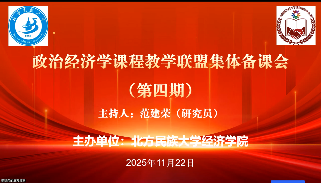11月22日下午,我校市级经济学课程群虚拟教研室联合发起全国政治经济学集体备课会,通过腾讯会议(会议号:762-903-838)顺利开展第四次线上集体备课。本次备课会由北方民族大学经济学院主办,政治经济学课程负责人范建荣研究员主持。来自澳门新葡京博彩、天津商业大学、北方民族大学、宁夏大学、兰州财经大学、天津财经大学、天津师范大学、西华大学、西北民族大学、西京学院、郑州商学院、昆明城市学院、重庆城市科技学院等14所高校政治经济学教学团队(课程组)33位任课教师齐聚云端,围绕马工程《马克思主义政治经济学概论》第三章市场经济和价值规律展开深入研讨。《马克思主义政治经济学概论》教材修订课题组(第二版)主要成员之一、南京大学经济学院副院长、博士生导师葛扬教授应邀指导备课会。