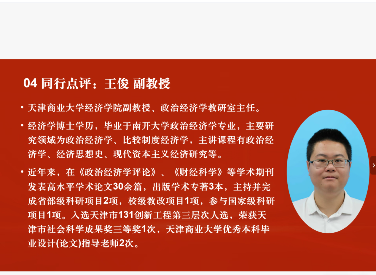在同行点评阶段,天津商业大学经济学院政治经济学教研室主任王俊副教授,从学科视角对本章教学内容进行了深入指导。他指出,本章不仅要讲清市场经济的一般性规律,更要突出中国道路的独特逻辑,通过对比社会主义市场经济与资本主义市场经济的差异,使学生理解我国在坚持市场经济基本规律的同时,如何通过制度优势实现更高效、更公平的资源配置,从而体现中国对市场经济的独特理解与实践路径。