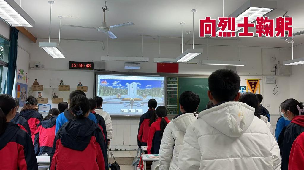 “红岩精神·云上传承”红岩英烈云端拜祭活动打破了学段和时空的限制,打造沉浸式云端思政课堂。整个祭拜活动庄重肃穆,先由组织老师播放了“11·27”革命英烈牺牲视频,引导同学们深刻了解了“11·27”纪念日那段用鲜血铸就的英雄历史;然后运用投影仪投放“VR全景”,让同学们“云参观”歌乐山烈士陵园;接着进入“中华英烈网”的祭扫页面,搜索红岩英烈们的姓名,讲述他们的英雄故事,为红岩烈士献上电子鲜花并鞠躬致敬,以此向红岩英烈表达缅怀之情。