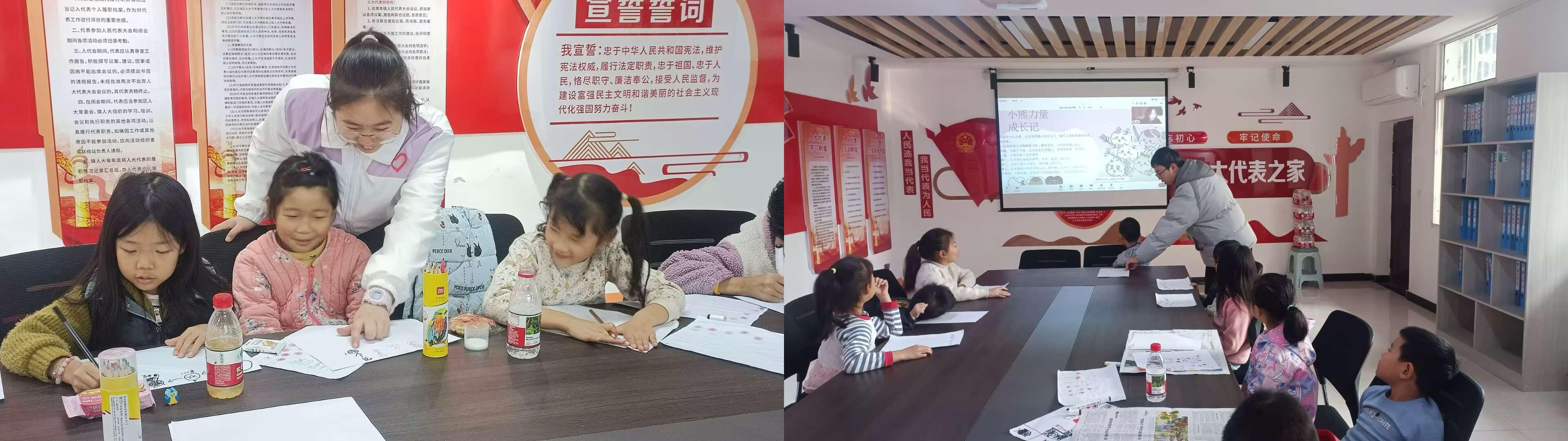 | (图1 志愿者辅导孩子,图2 志愿者为孩子讲解) |