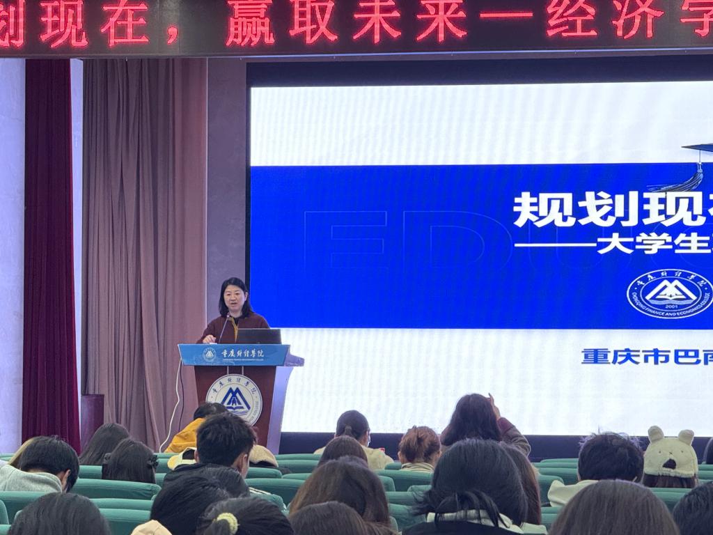 为助力2025级新生在学业起点锚定发展方向,提升自我发展能力,实现“个个有赛道,人人能出彩”的培养目标,2025年11月26日中午,经济学院在学术报告厅开展“规划现在,赢取未来——大学生职业生涯规划”专题讲座。本次讲座由经济学院院长宋湘琴主持,特邀顾迪集团联合创始人、重庆市巴南区中小企业公共服务中心主任、重庆士继嘉知识产权研究院执行院长甘国平担任主讲,学院2025级全体新生参加。
