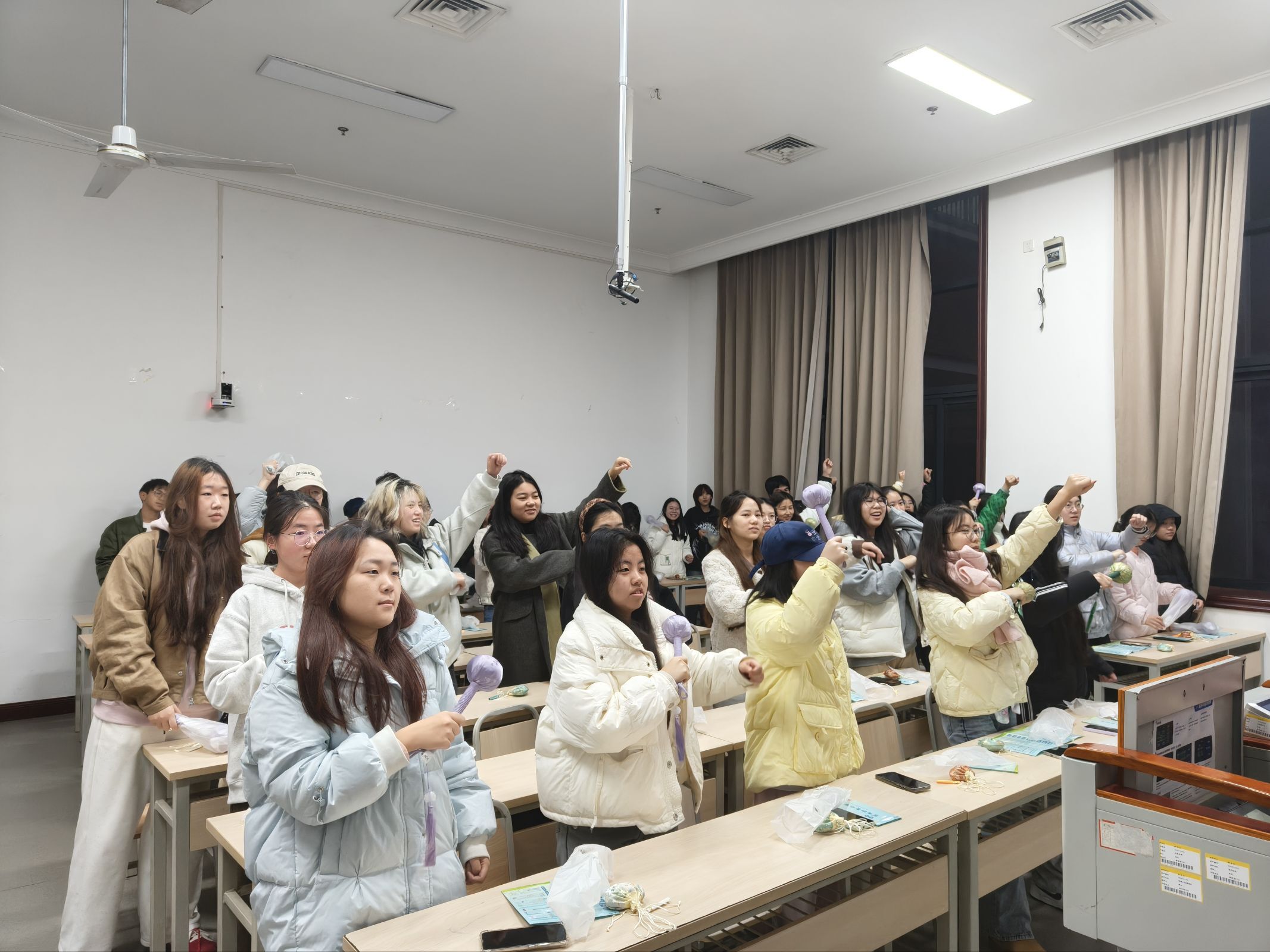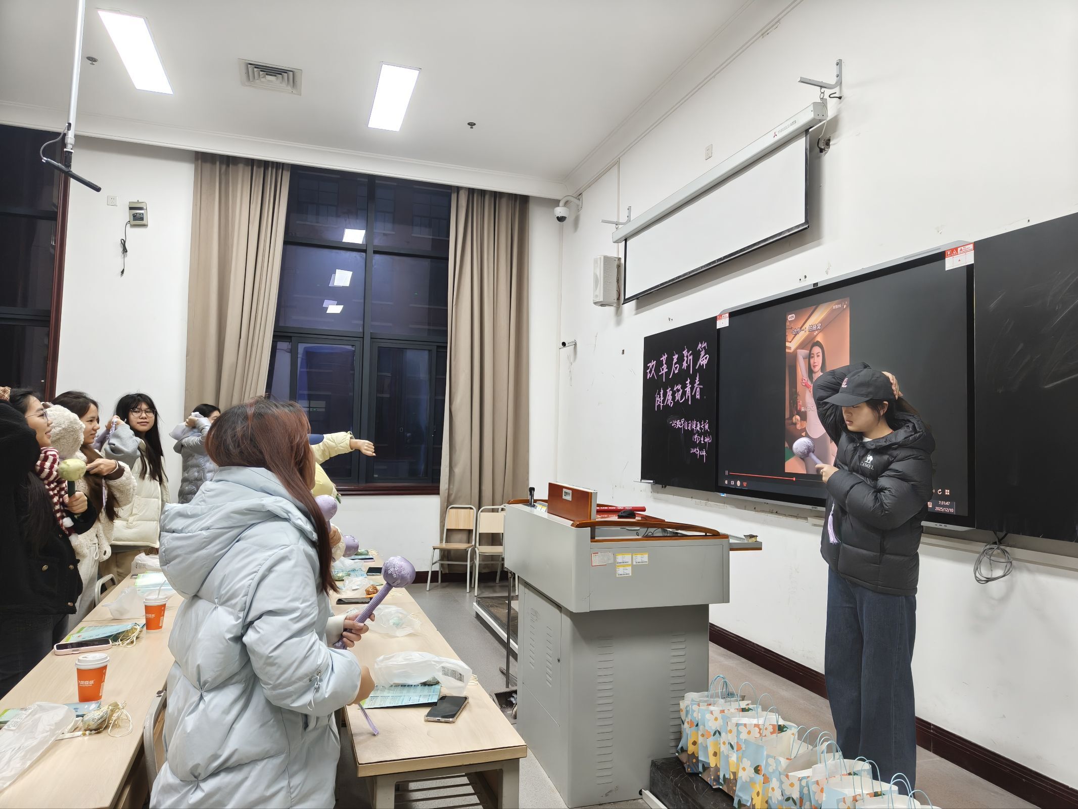 互动环节将现场气氛推向高潮。各教室同步开展健康知识竞答与趣味互动活动:健康知识竞答环节围绕宣讲核心内容设置选择题与判断题,通过举手抢答的形式评选出优胜者;趣味互动环节则结合养生主题,设计“拍八虚养生操跟跳”活动,有效提升了活动的趣味性与同学们的参与热情。互动环节结束后,工作人员为优胜者现场发放了定制获奖大礼包。活动尾声,各教室宣讲组与参与同学集体合影,全体宣讲成员及工作人员也集中留念,用镜头定格下这一意义瞬间。