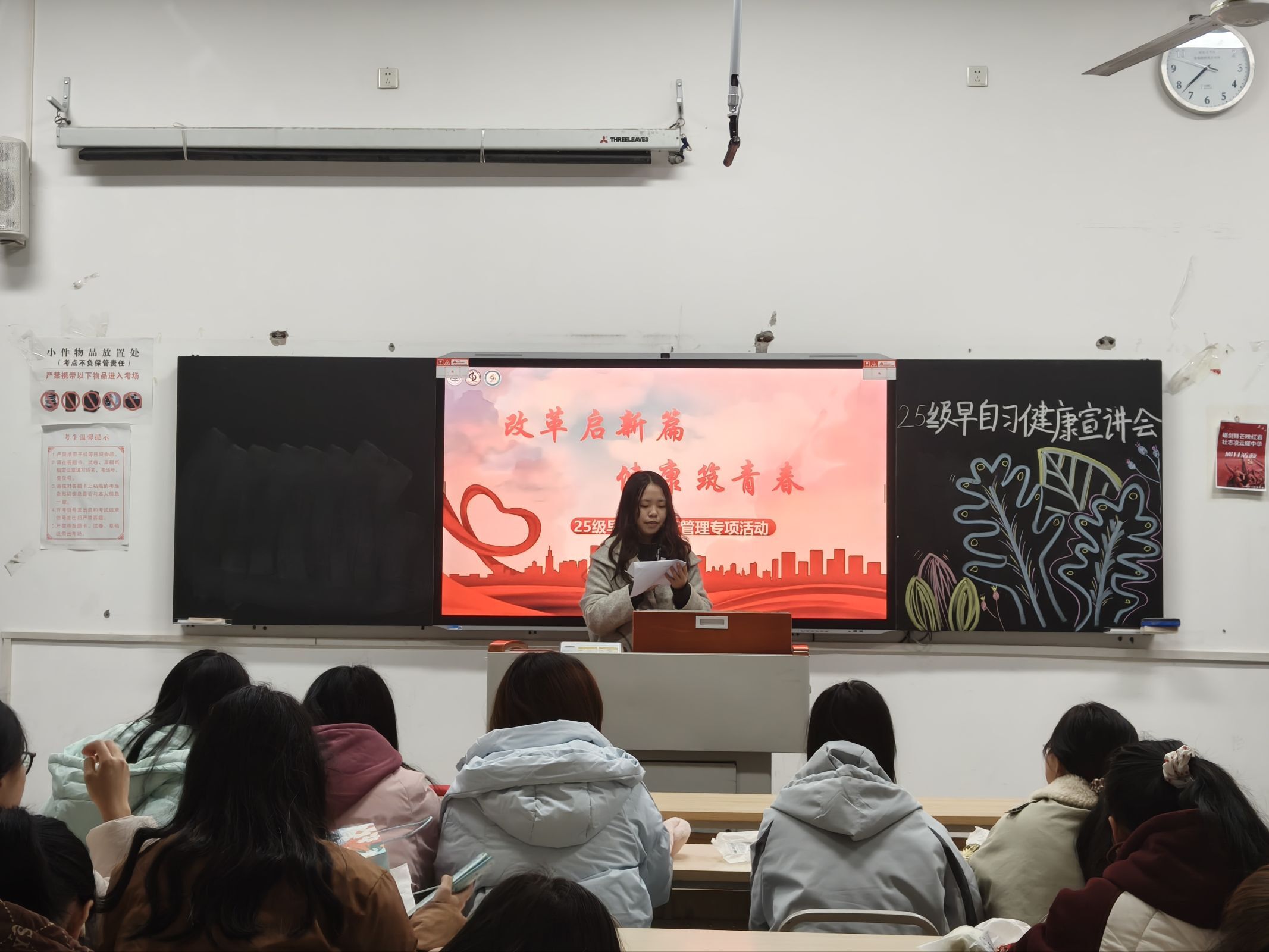 活动当天,同学们按班级有序前往指定教室签到,领取健康宣教手册及定制香囊后依次就座。宣讲环节在5个教室同步展开,各宣讲组围绕三大核心内容展开系统讲解:一是解读2025级早自习改革的背景意义、创新亮点及对新生能力提升的具体价值,帮助新生深刻认识到早自习改革的重要性;二是传授早自习全流程健康管理技巧,涵盖早自习前的身心唤醒方法、自习中的精力维持技巧及自习后的放松调理建议,并结合健康服务管理专业的核心知识提供科学指导;三是融入“健康Π”计划理念,向新生介绍量化健康管理思维在早自习时间规划、学习状态监测中的实践应用方法。