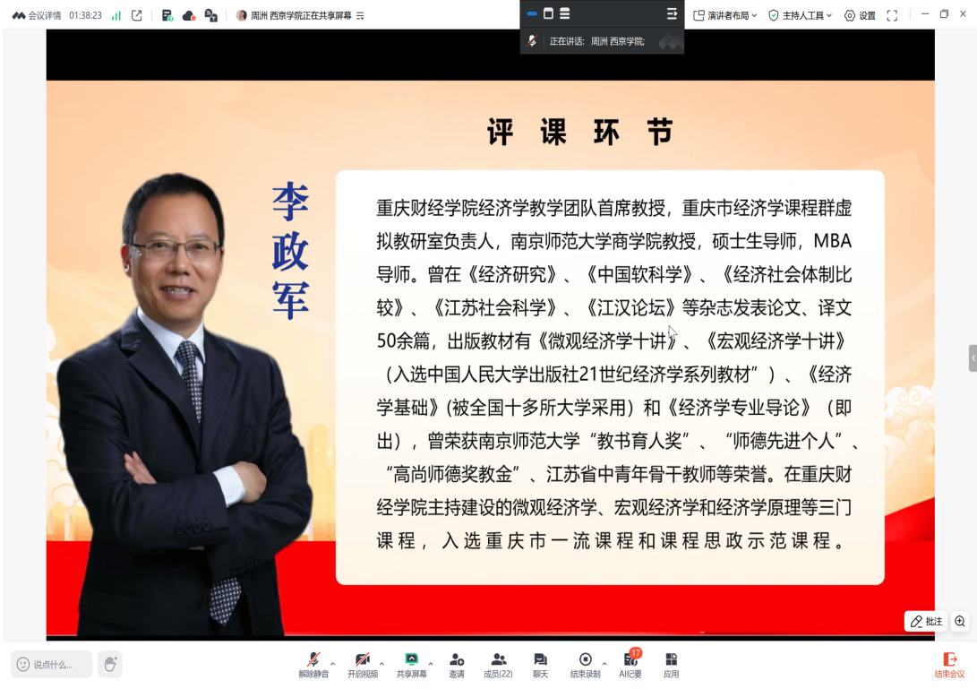 在评课环节,我校市级经济学课程群虚拟教研室负责人李政军教授从理论体系结构出发,对第六章教学进行了系统点评。他指出,资本循环、资本周转与社会总资本再生产构成内在统一的理论整体,第六章在课程体系中具有承上启下的重要作用,教学中应引导学生形成系统性、整体性的理论认知。