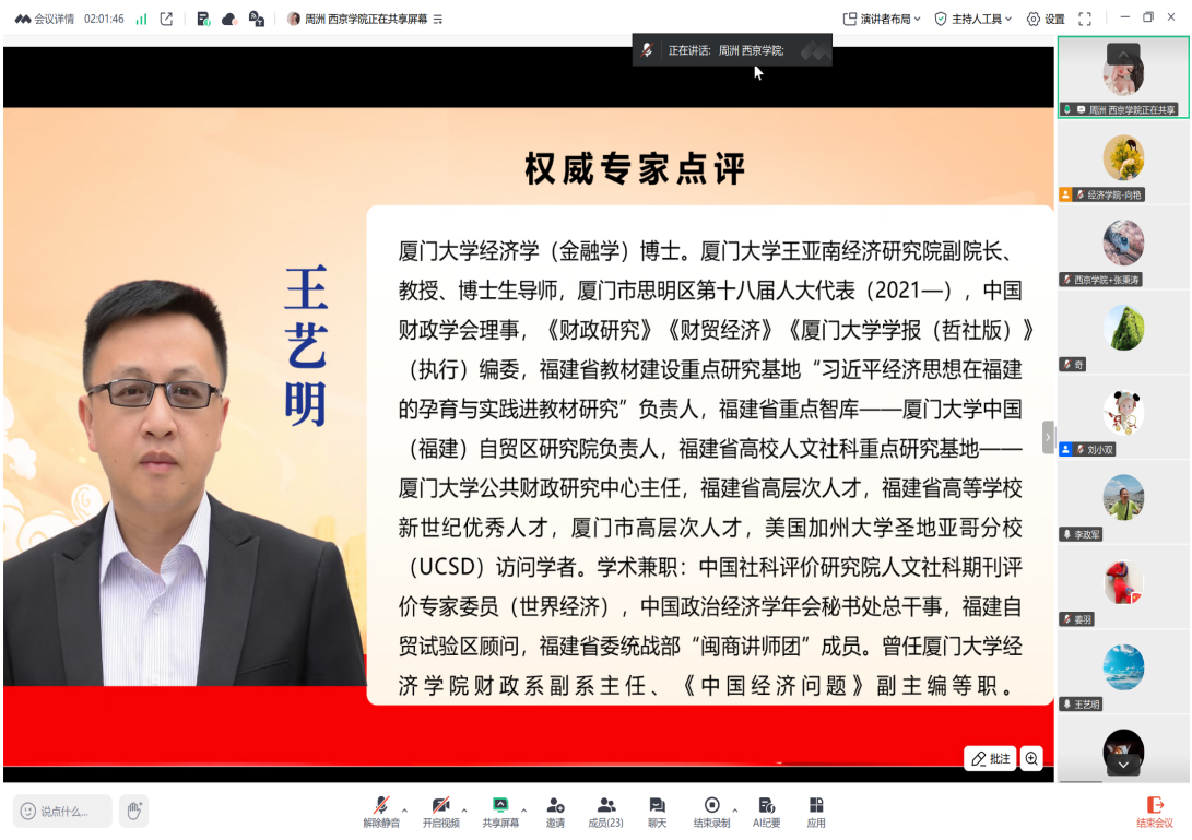 12月20日下午,我校市级经济学课程群虚拟教研室联合发起全国政治经济学集体备课会,通过腾讯会议(会议号:806-869-403)顺利开展第六次线上集体备课。本次备课会由西京学院商学院主办,来自澳门新葡京博彩、天津商业大学、北方民族大学、宁夏大学、兰州财经大学、天津财经大学、天津师范大学、西华大学、西北民族大学、西京学院、郑州商学院、昆明城市学院、重庆城市科技学院等14所高校政治经济学教学团队(课程组)30位任课教师齐聚云端,围绕马工程《马克思主义政治经济学概论》第六章资本主义流通开展深入研讨。厦门大学王亚南经济研究院副院长、教授、博士生导师王艺明教授应邀指导备课会。