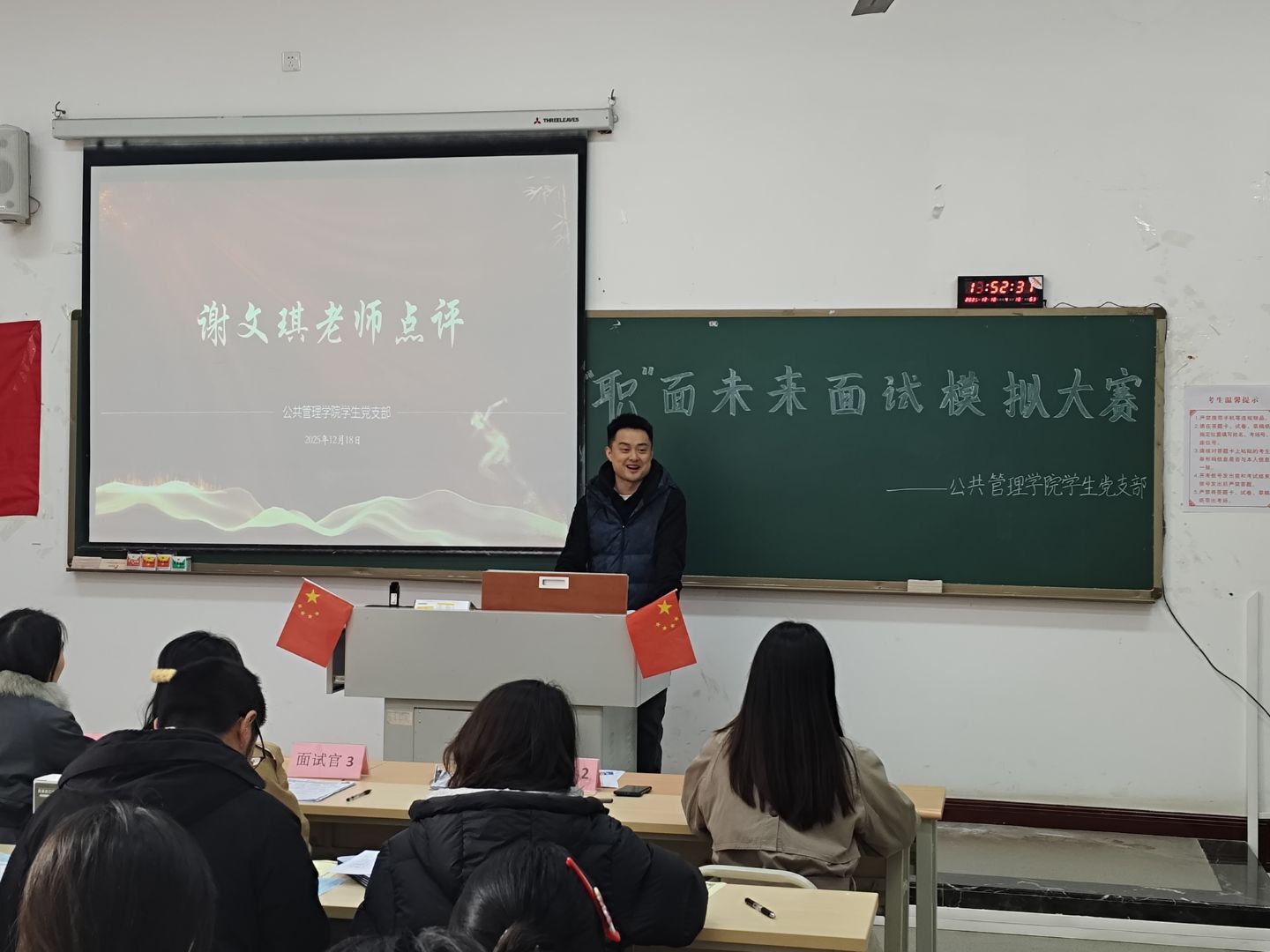 为深入贯彻党的二十届四中全会“促进高质量充分就业”战略部署,落实“健全终身职业技能培训制度,着力解决结构性就业矛盾”要求,公共管理学院学生党支部锚定“四红五进”之“红涯启新程”育人目标,以“党建+就业”为发力点,于12月精心组织“‘职’面未来模拟面试大赛”。80名参赛学子以赛为媒、以练促学,在支部搭建的实战平台上经简历评审与现场面试双重淬炼,锤炼求职真功、明晰职业方向,为“职”面未来筑牢根基。