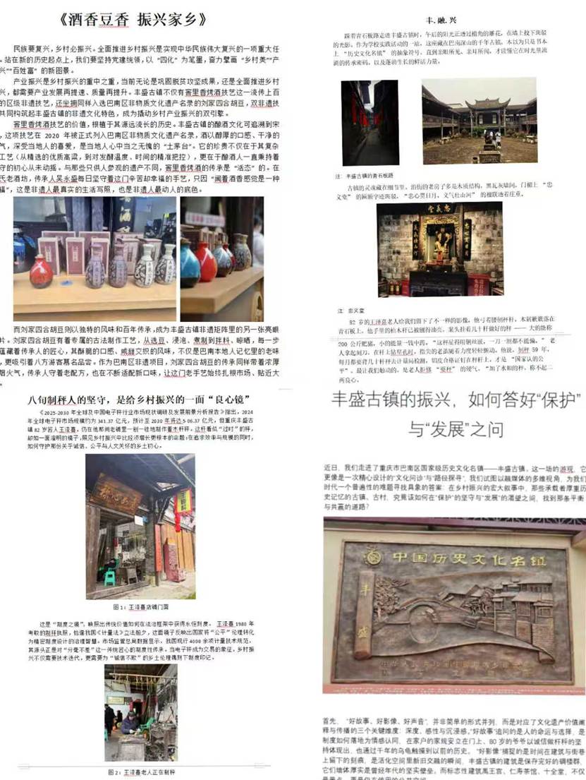 本次实践周累计累计吸引全院千余人次学生深入参与,产出各类作品、报告数百件,涵盖新闻评论、视频创作、展陈策划、AI生成内容、商业访谈实录等多种形式。校企联合评审、行业导师点评、优秀作品认证等机制,有效提升了实践成果的专业水准与社会价值。值得一提的是,学院此前组建的“巴山e行”志愿服务队已获丰盛镇人民政府感谢信,其暑期开展的公益带货、非遗纪录片创作以及11月举办的乡村观察员活动等乡村振兴实践成果,为本次实践周的校地合作奠定了坚实基础。
