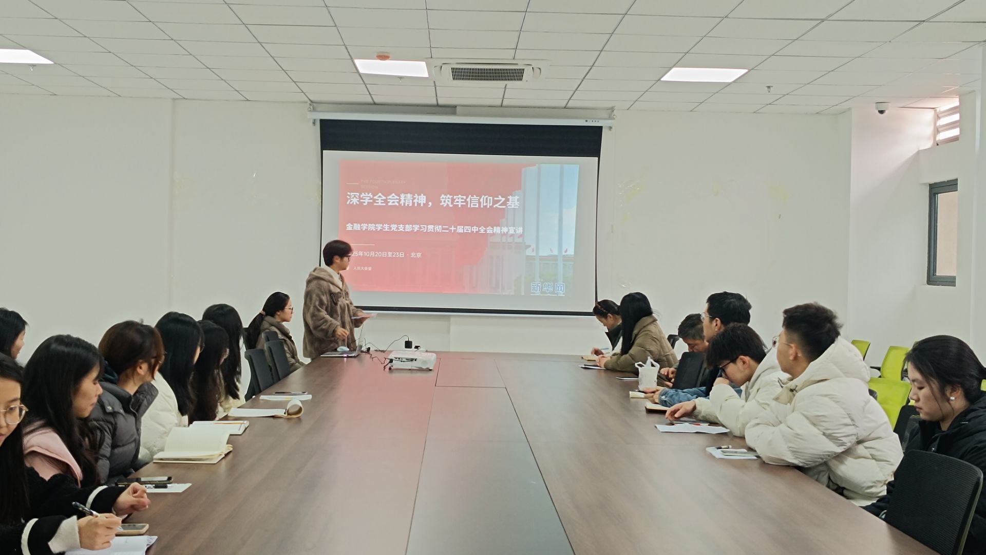 为深入学习贯彻党的二十届四中全会精神,推动全会精神在青年学生群体中入脑入心、见行见效,金融学院学生党支部严格落实学校党委和学院党总支统一部署,构建“党总支统筹引领、支部精准落实、党员全面参与、师生协同联动” 的学习宣讲体系,通过多层次、多场景、全覆盖的宣讲活动,引导广大学生党员和青年学子在学思践悟中坚定理想信念、勇担时代使命。