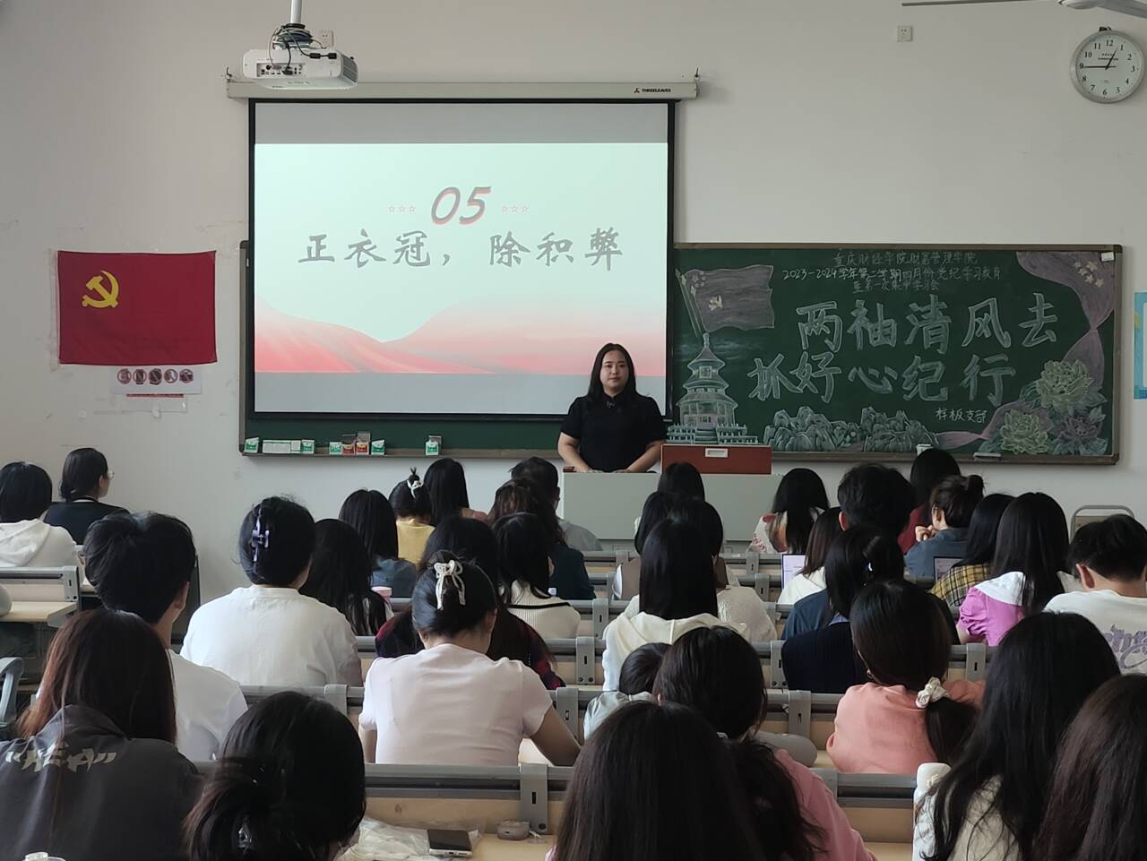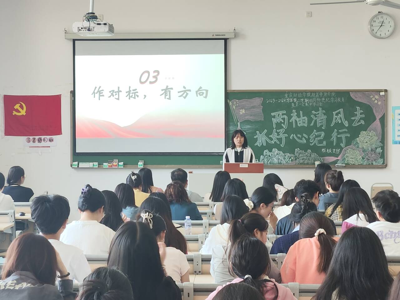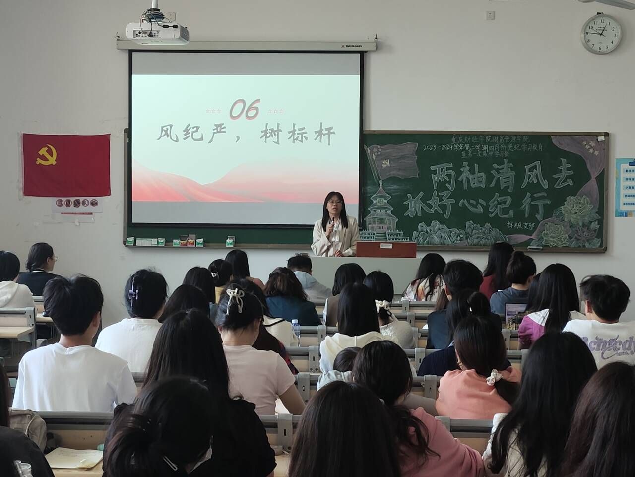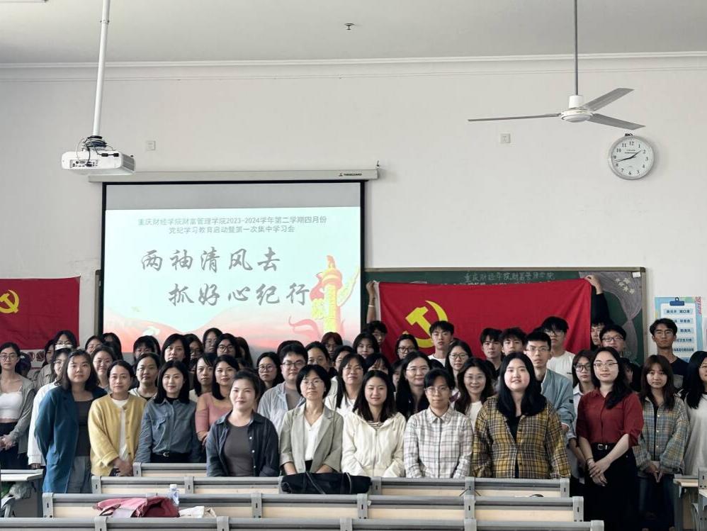 习近平总书记指出,要全面加强党的纪律建设,党规制定、党纪教育、执纪监督全过程都要贯彻严的要求。为进一步贯彻落实习近平总书记关于党纪教育和纪律建设工作的指示批示,推进党纪学习教育常态化长效化,进一步加强我院党的纪律建设。4月26日中午,我校财富管理学院教师党支部联合学生党支部在教学楼1623教室开展了以“两袖清风去,抓好心纪行”为主题的党纪学习教育启动会暨第一次集中学习会。全体教师党员、学生党员、预备党员以及党员服务站全体工作人员参加本次会议。